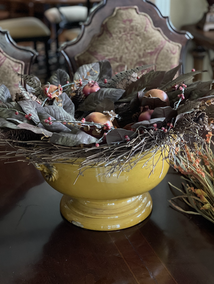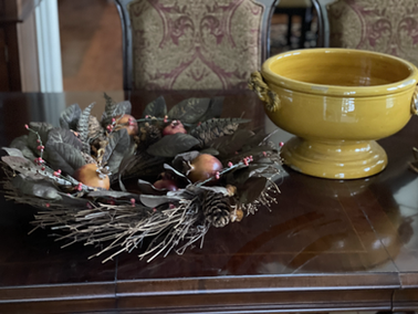 Here is one of my simple Fall centerpiece arrangements I put together for the dining table. I started by using a wreath as the base, and built up by using Fall floral picks to fill in the large bowl. I also placed pumpkins in the large pots in front of out house for something simple.